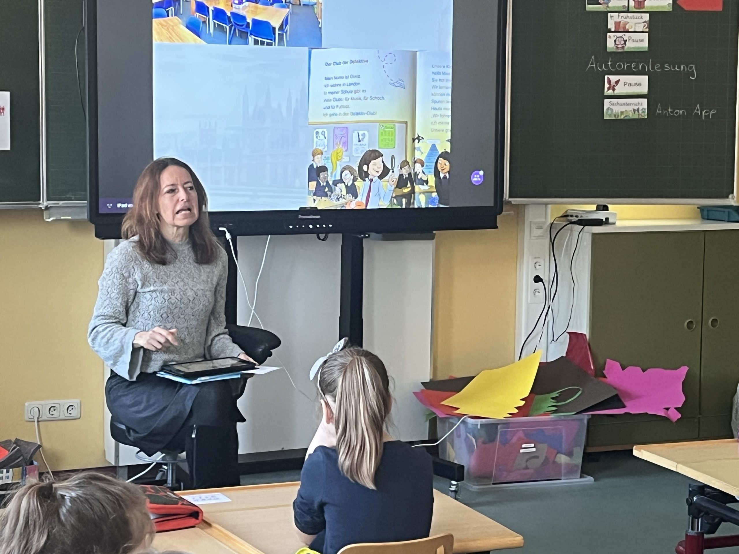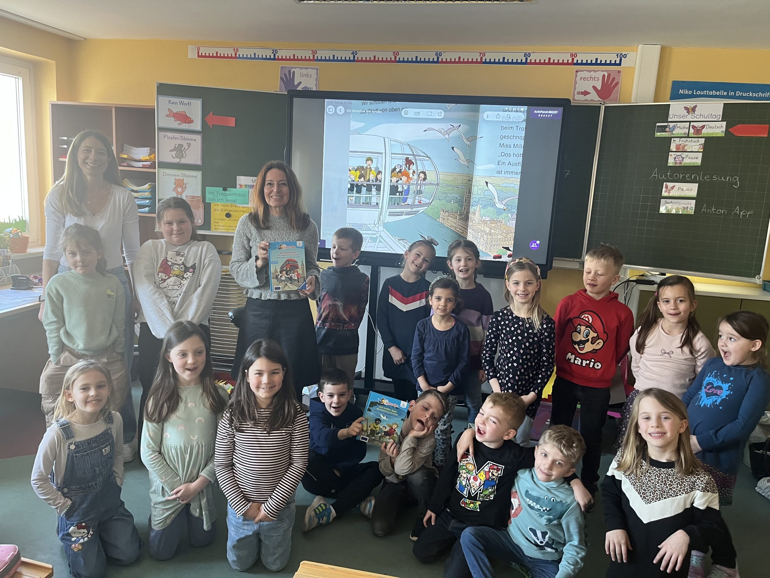 Für die Erst- und Zweitklässler brachte die Autorin eine Premiere mit: Zum ersten Mal las sie aus ihrem Leserabe-Buch Auf heißer Spur – Die Detektive von London. Lebendig und anschaulich erzählte sie von den Abenteuern der jungen Detektive und spannte dabei immer wieder den Bogen zu London, ihrer Heimatstadt. Mit vielen interessanten und kindgerecht aufbereiteten Informationen über die britische Metropole – von berühmten Sehenswürdigkeiten bis zum Alltag in der Großstadt – machte sie die Kulisse ihrer Geschichte für die Kinder greifbar. So wurde die Lesung zugleich zu einer kleinen Reise an die Themse.
