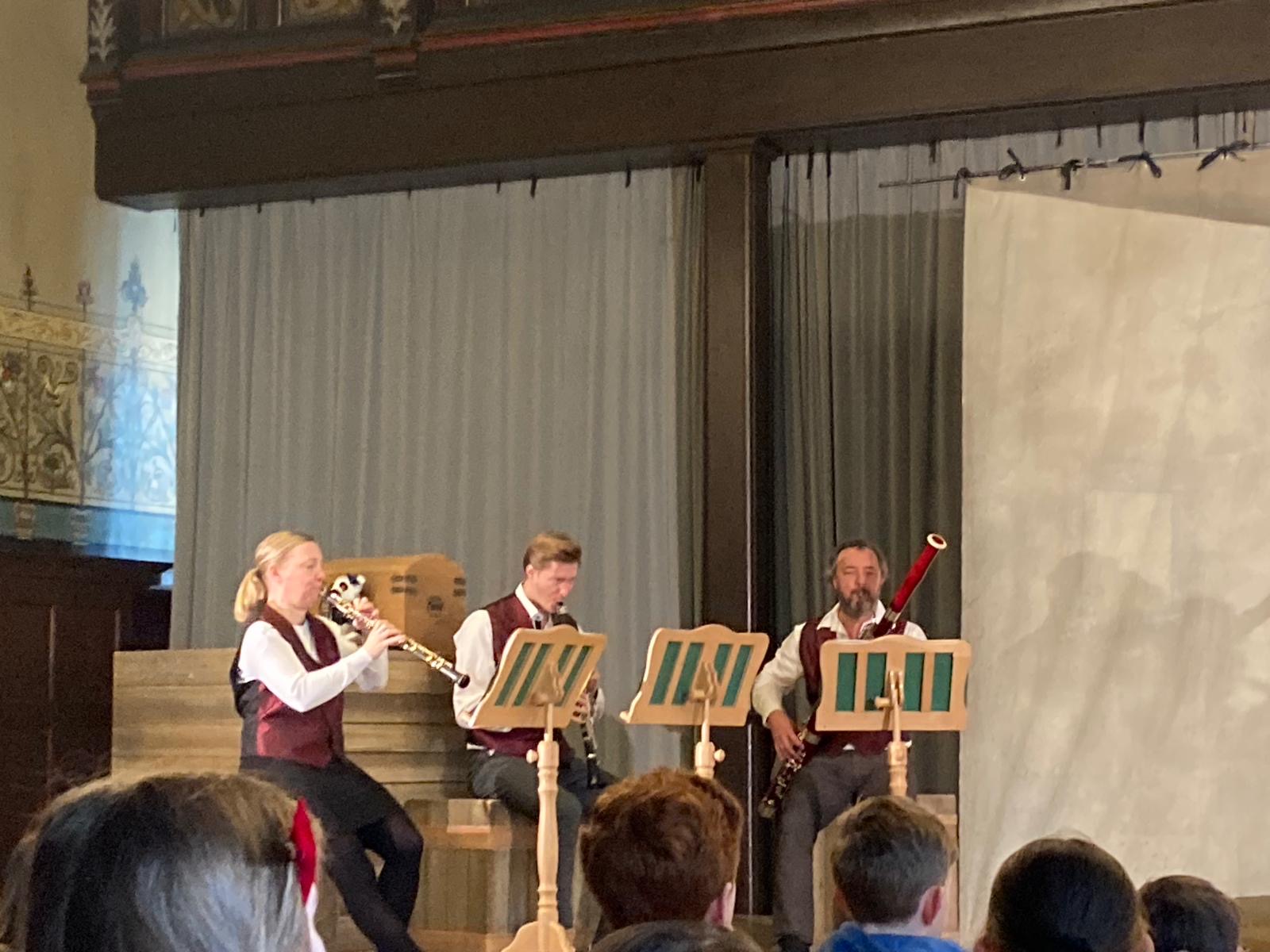 Dort präsentierten 5 Musiker der Rheinischen Philharmonie das Kinderkonzert „Beethoven zieht wieder um“. Die Kinder waren begeistert von der humorvollen Darbietung und den vielfachen Gelegenheiten zum Mit-Musizieren.